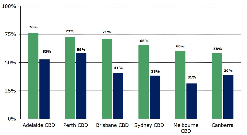 Perth saw office occupancies rise from 63% to 65%, with Melbourne seeing a 1 percentage point rise to 49%. The ACT saw office occupancies decline from 60% to 53%.