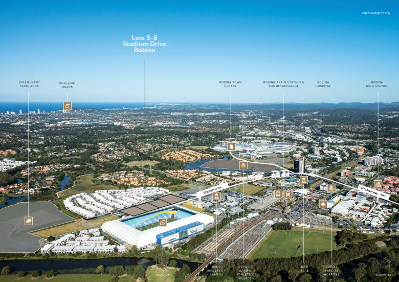 The site, situated in Robina’s Stadium Village Precinct, is conveniently located only a short walk from key amenities and infrastructure including Robina Town Centre, Robina Train Station (with direct trains to Brisbane Airport), Cbus Super Stadium, Robina Hospital, and the wider Robina Health Precinct.