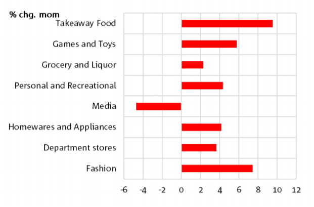 When breaking down the data by industry on a month-on-month basis, all categories except media recorded positive growth. A notable increase in relevance was seen in takeaway food, with sales increasing by almost 10%, followed by fashion (around 7.5%), games and toys (around 6%) then personal and recreation (around 4%).
