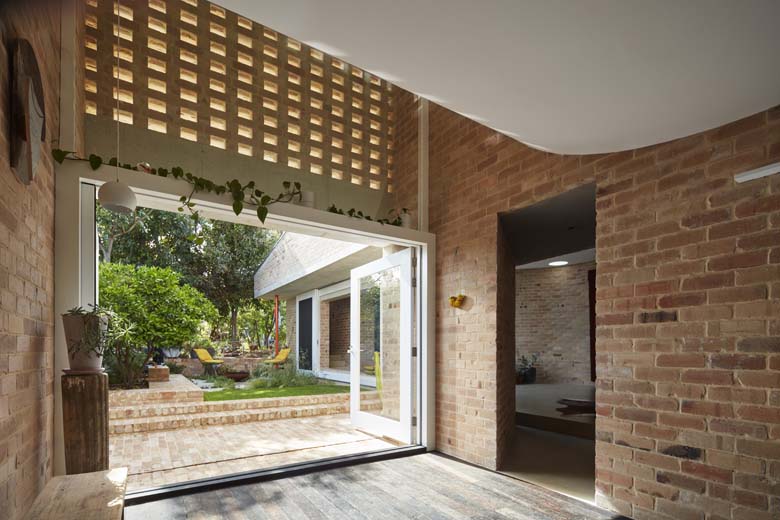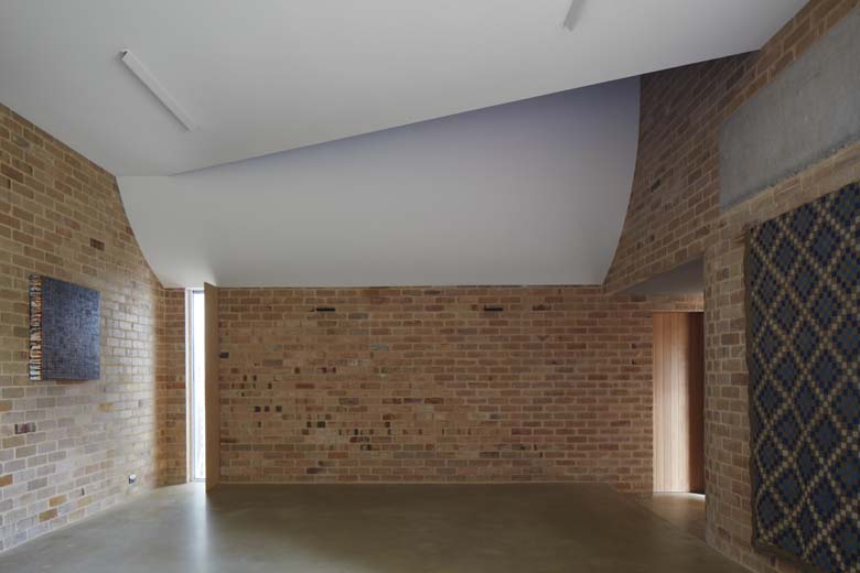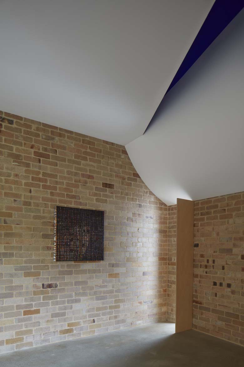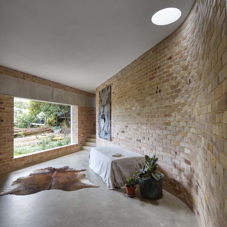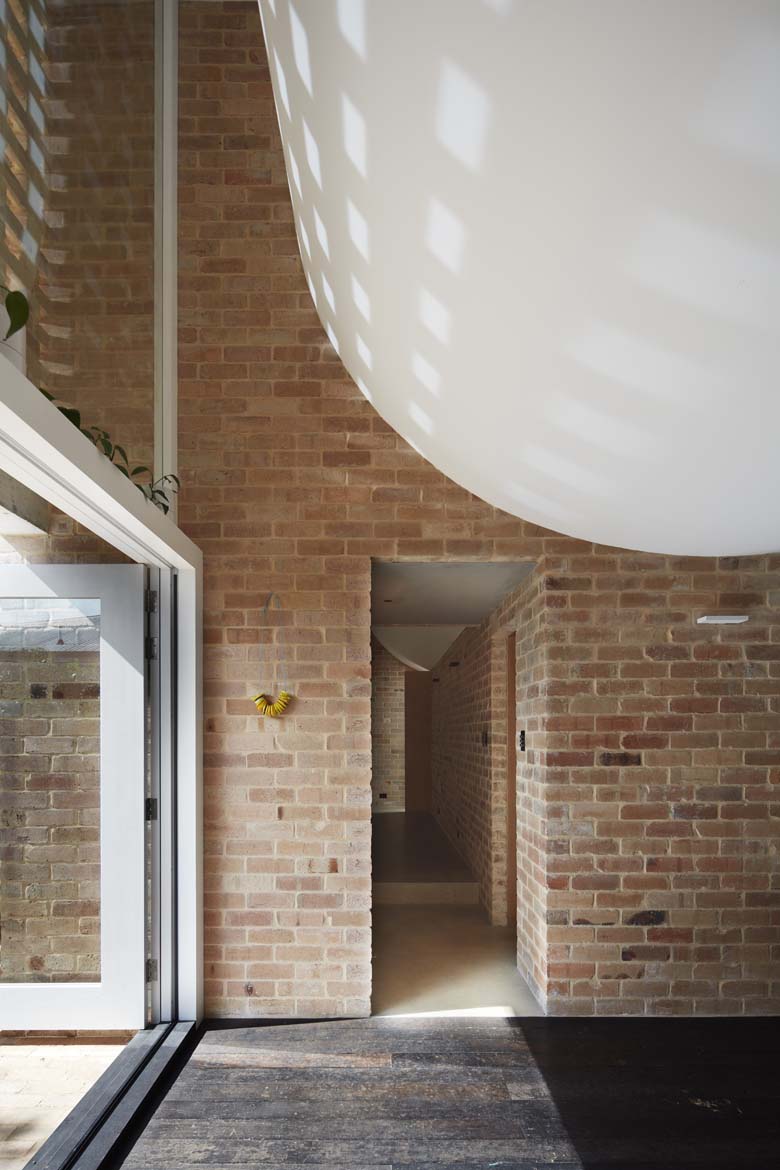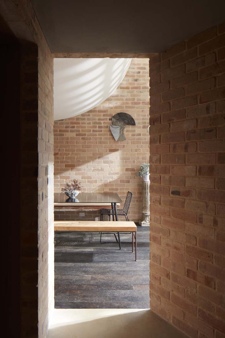 Brick has been used inside and out with grounding effect to create mass, both visual and thermal. Yet the weight of the building’s form is lightened by the texture of the recycled pressed bricks which have been left in their raw state. “We had contemplated using red recycled bricks which were going to be painted white,” says Simon.