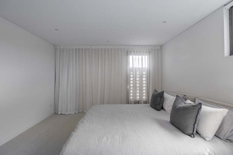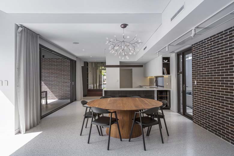 The unusually wide 1.5 metre hallway is left completely open and unobstructed, it extends through the original house with its jarrah floors, and down three steps onto an expanse of ultra-white concrete. The hallway itself is lifted by new top lights installed above the doors that open into it. Float glass gives views upwards into the flanking rooms; expressing their ornate ceilings, and drawing light into the corridor. At the end of the raised passage, the floor turns to glass and the footings of the original house are exposed around a new cellar.