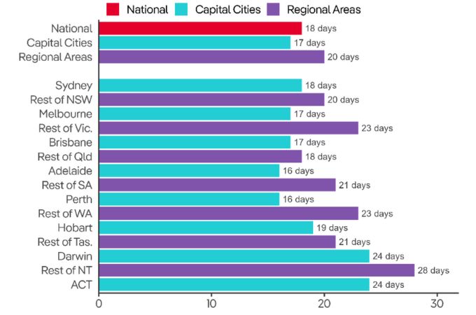 While rental stock in regional areas is taking longer to be snapped up than the historic lows seen during the pandemic, time on the market still remains considerably low. In March the median time was 20 days – an increase of 3 days compared to 12 months ago.