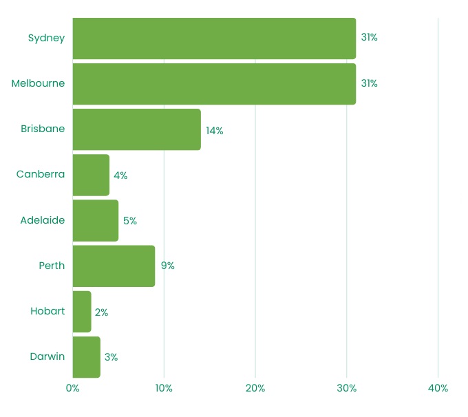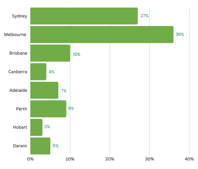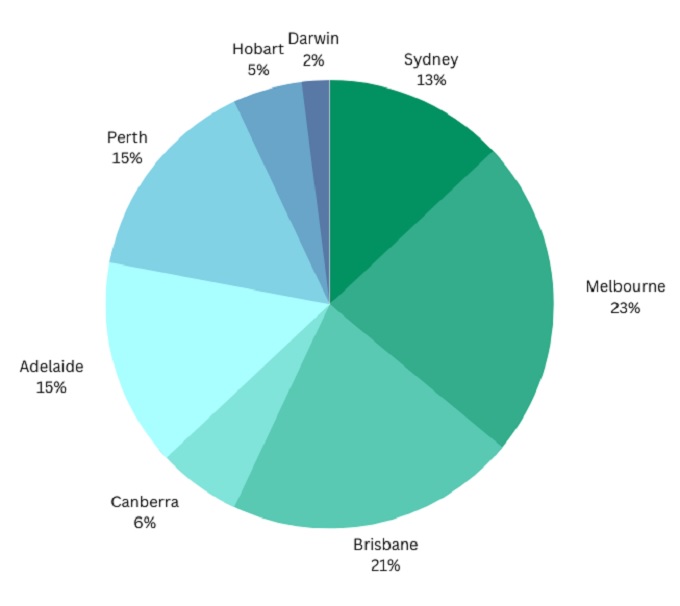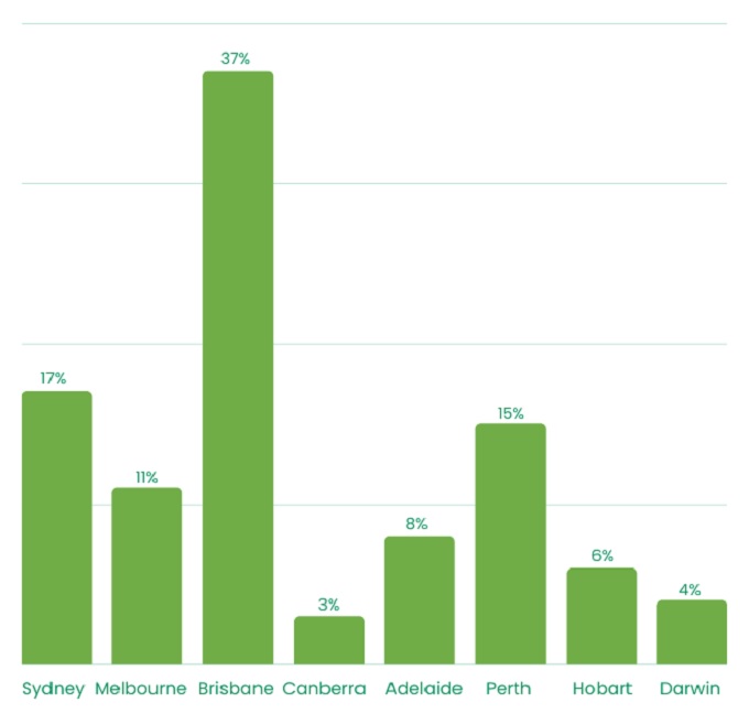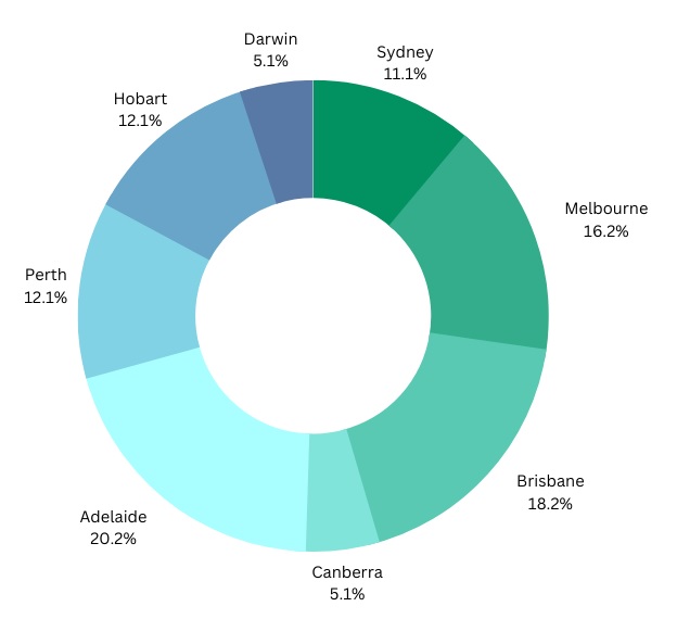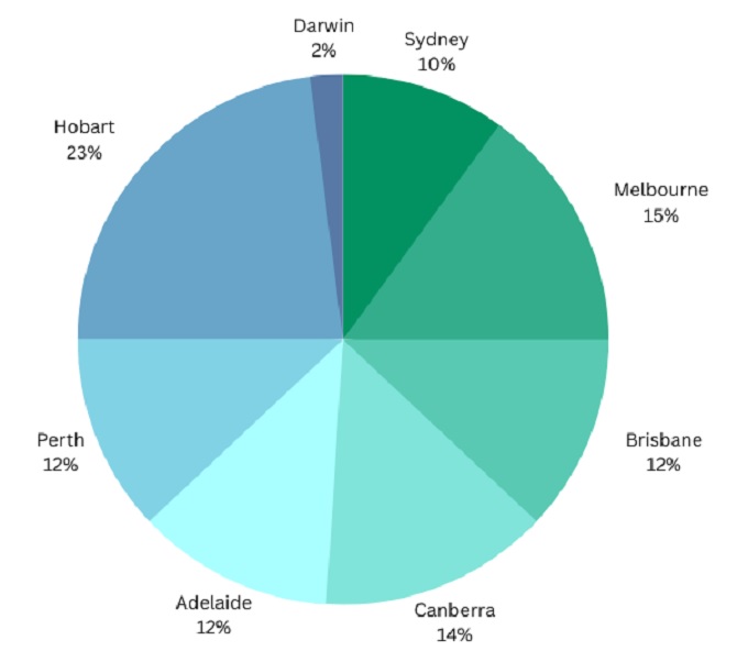Adelaide was followed by Brisbane (18%), Melbourne (16%), Perth (12%), Sydney (11%), Hobart (5%) and Canberra (5%) and Darwin (2%).