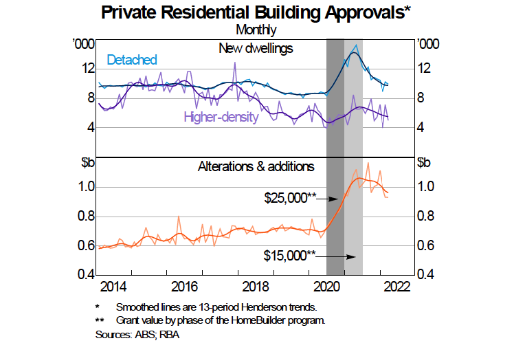 Building approvals support my position, too. Data presented by the Reserve Bank of Australia shows building approvals for high-density housing have been trending downward since mid 2021.