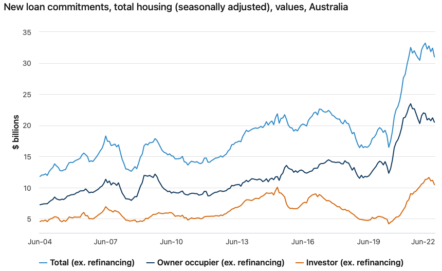 ABS data showed to June 2022 lending for investor housing fell 6.3 per cent to $10.5 billion. In addition, lending to investors remains proportionally low compared to owner occupiers for now. That said, investor lending is firming on an annual basis. CoreLogic analysis reveals the proportion of total lending going to investors has risen dramatically since June 2020.