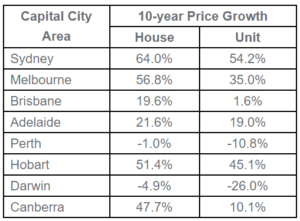 Over the long term, houses have delivered materially higher capital growth and total return (i.e., average capital growth and the average rental yield) than rental apartments, although units in some desirable areas of the mature capital cities have also performed well (see table below).